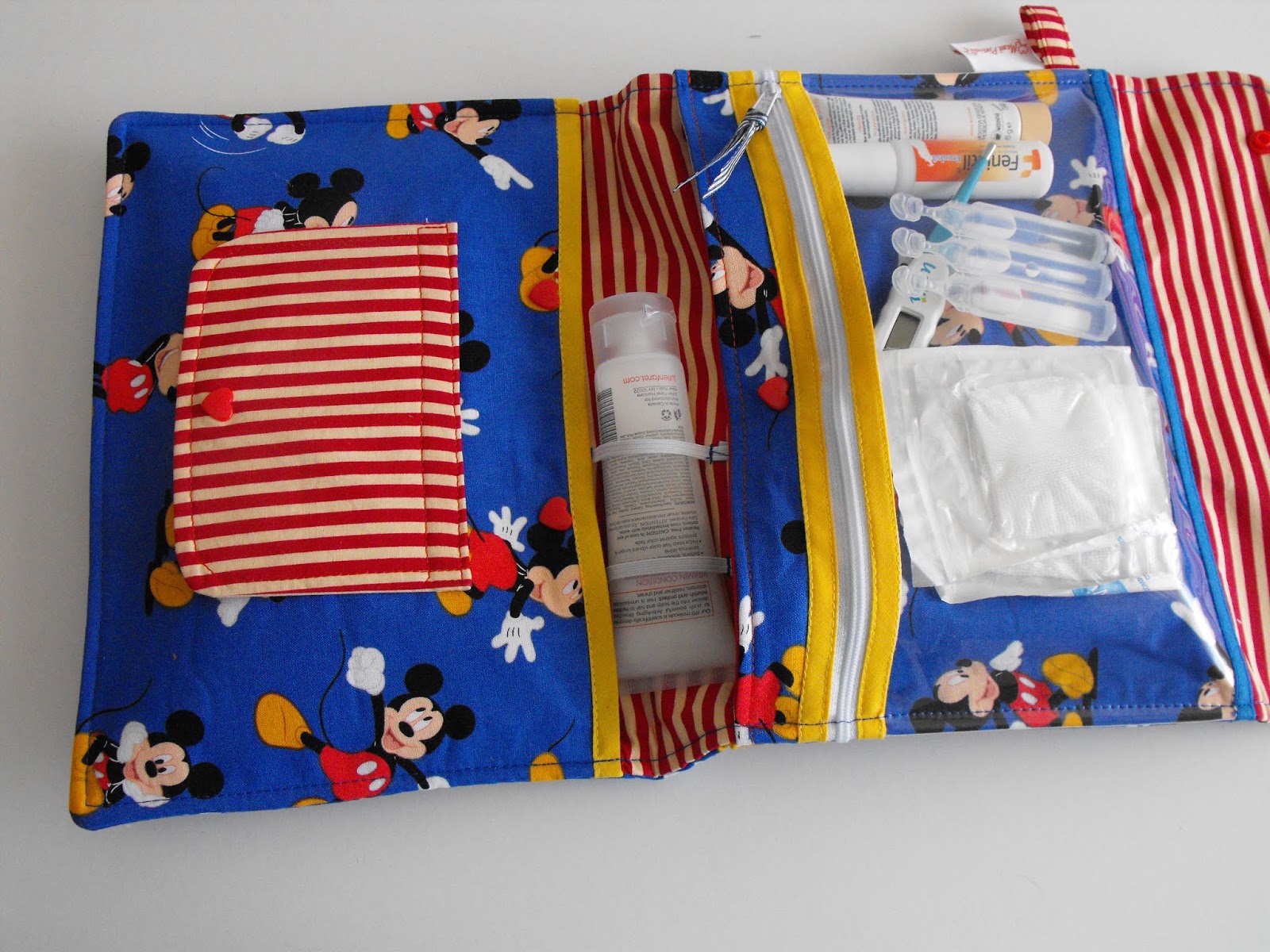 Numa prática bolsinha, leva fraldas,toalhetes,creme e com um bolso maravilhoso transparente para levar pequenas coisas como comprensas,termómetro, unidoses de soro...tudo o que necessita levar para uma saída de casa.